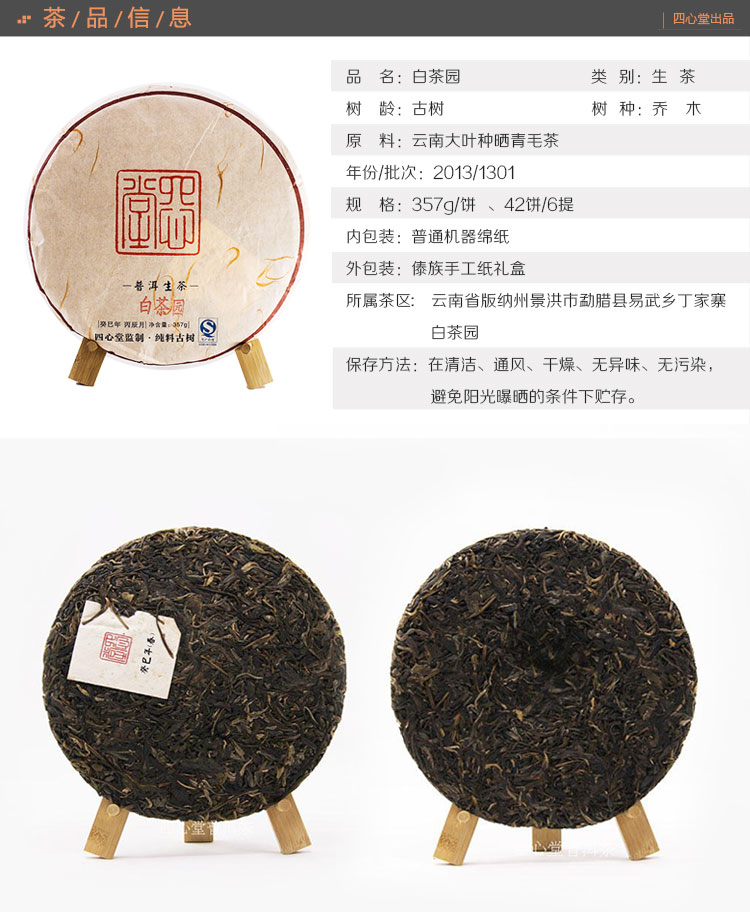 白茶园 普洱生茶 2013年春 357克